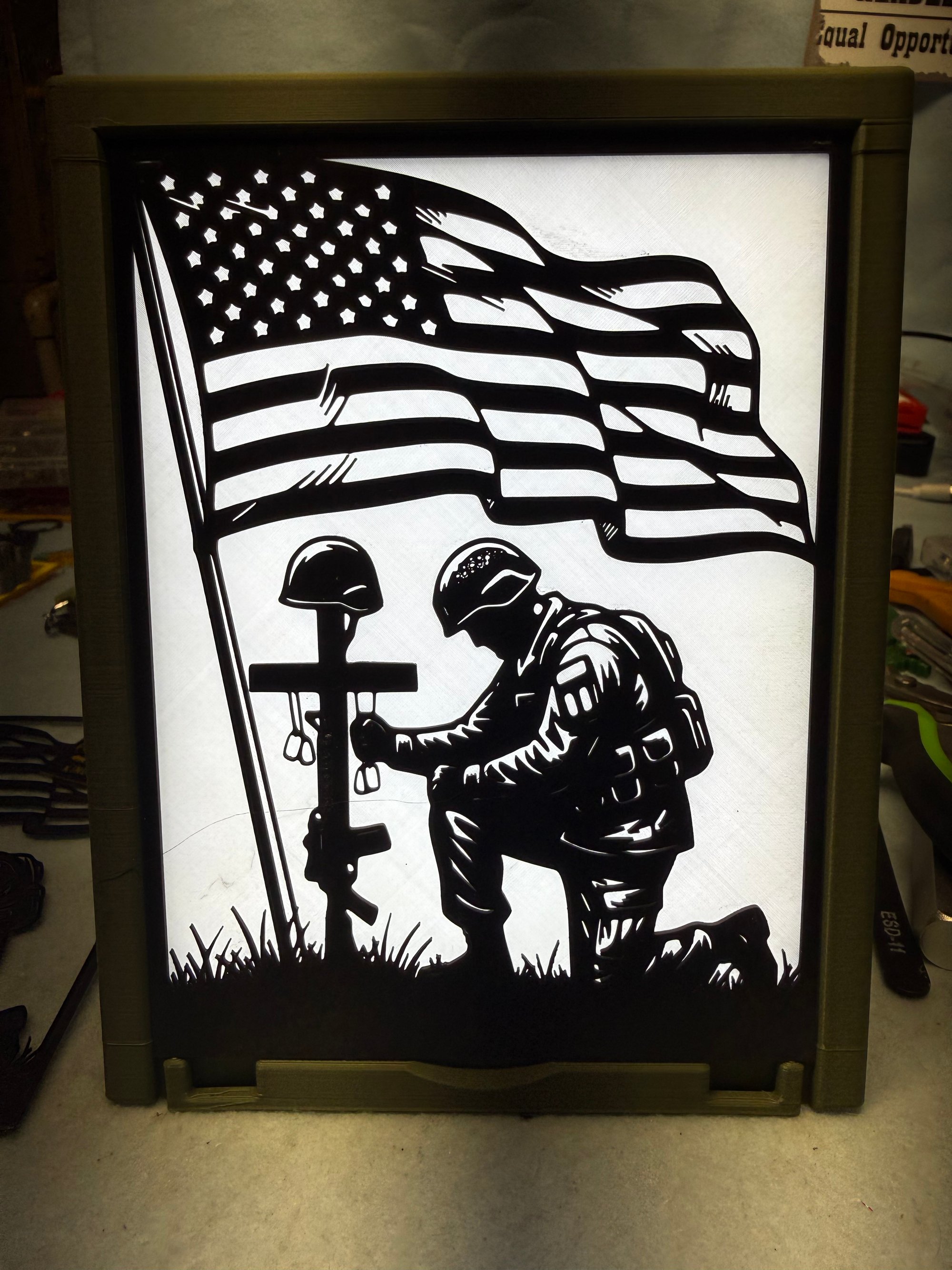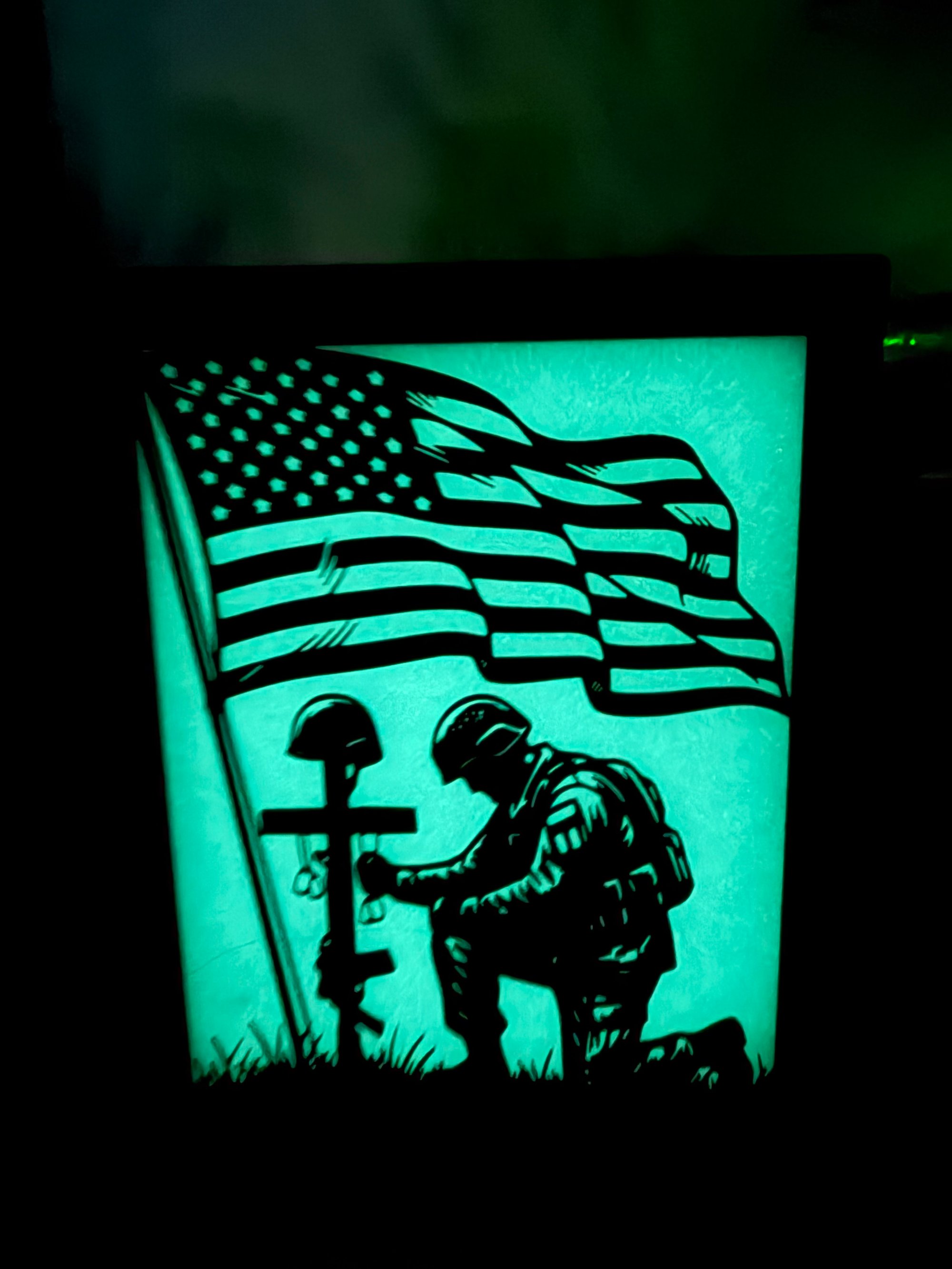 Respect for our fallen, Never Forget is dedicated to those who fought and died for our country. This one is made to act as a nightlight. The backing is glow in the dark so when the light is turned off it softly glows. It will glow for about 6 hours. The Frame is Olive Drab, or can be made in other colors, but Olive Drab seems fitting.