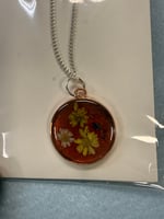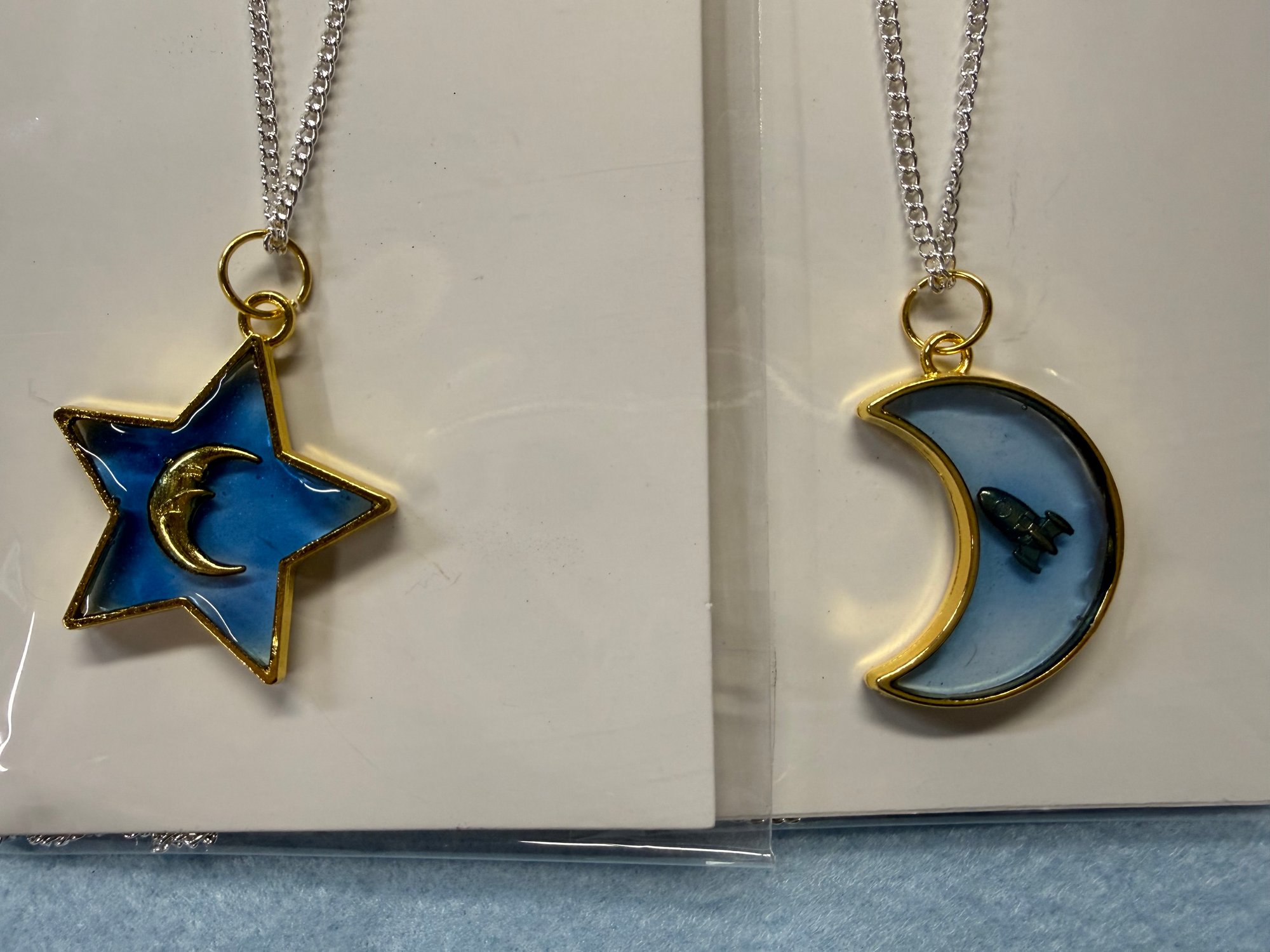 Hand Made Pendants, each one unique. Variety of types, Round, Square, Rectangular, Moon, Stars. We also make to order with Flower inserts, charms, or mica colors. Choice of silver chain or waxed rope necklace to hang it from.