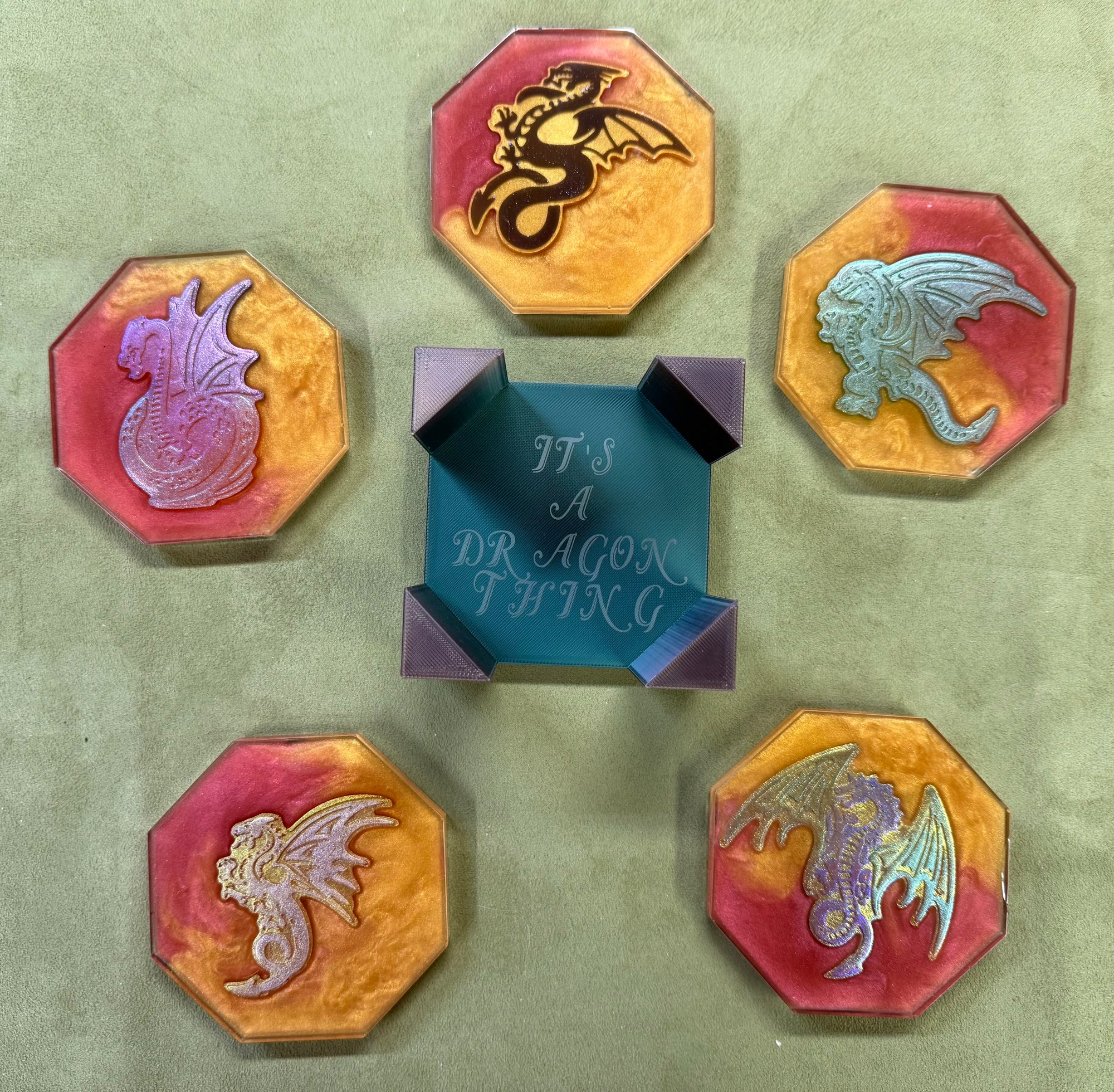 We also have Resin coasters which of course, can be customized to your liking. Each set has 5 coasters with a holder. They have a cork backing to protect the surface they are on.