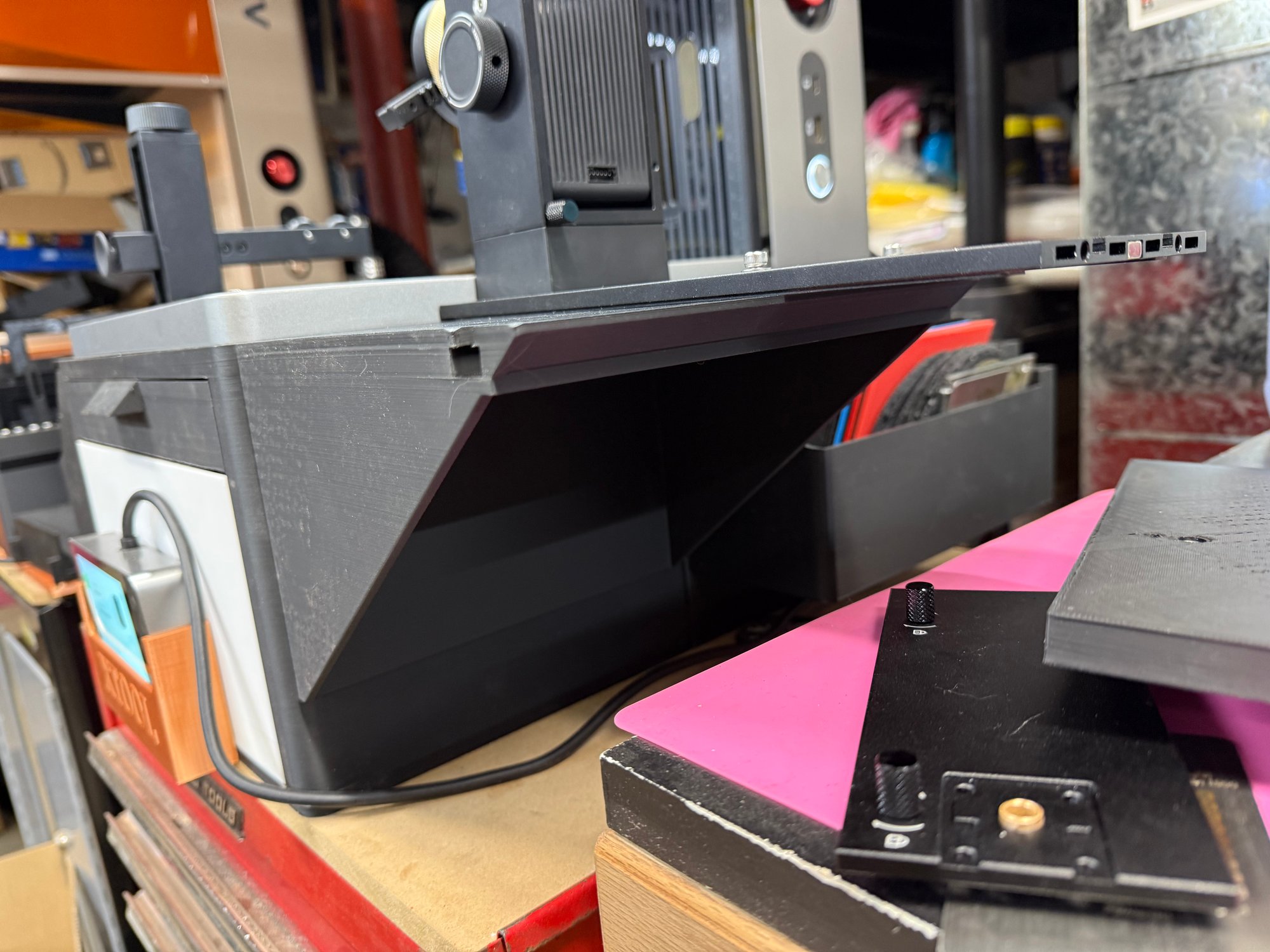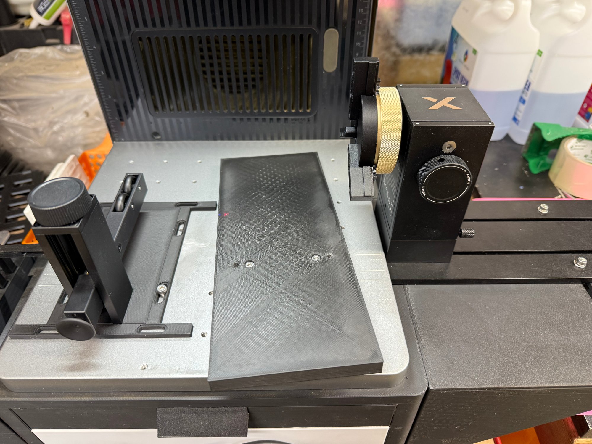 For those who need more room for their RA3 on the Ultra platforms, and have either base unit, this will give what you need. It moves the RA3 off the lasers base, off to the side, and lowers it to flush or below the base for better clearance for larger objects. There is also an adapter to put the roller rest at a lower height and lock it to the bed. The RA3 plate is locked to the extension arm using a T-block and existing holes in the plate, the riser plate is locked in place the same way and the RA3 base is then attached to it. The roller support plate has slots for left-Right and up-down positioning as needed. Includes replacement tray to store the extra parts and not need to disassemble the roller support to store it.