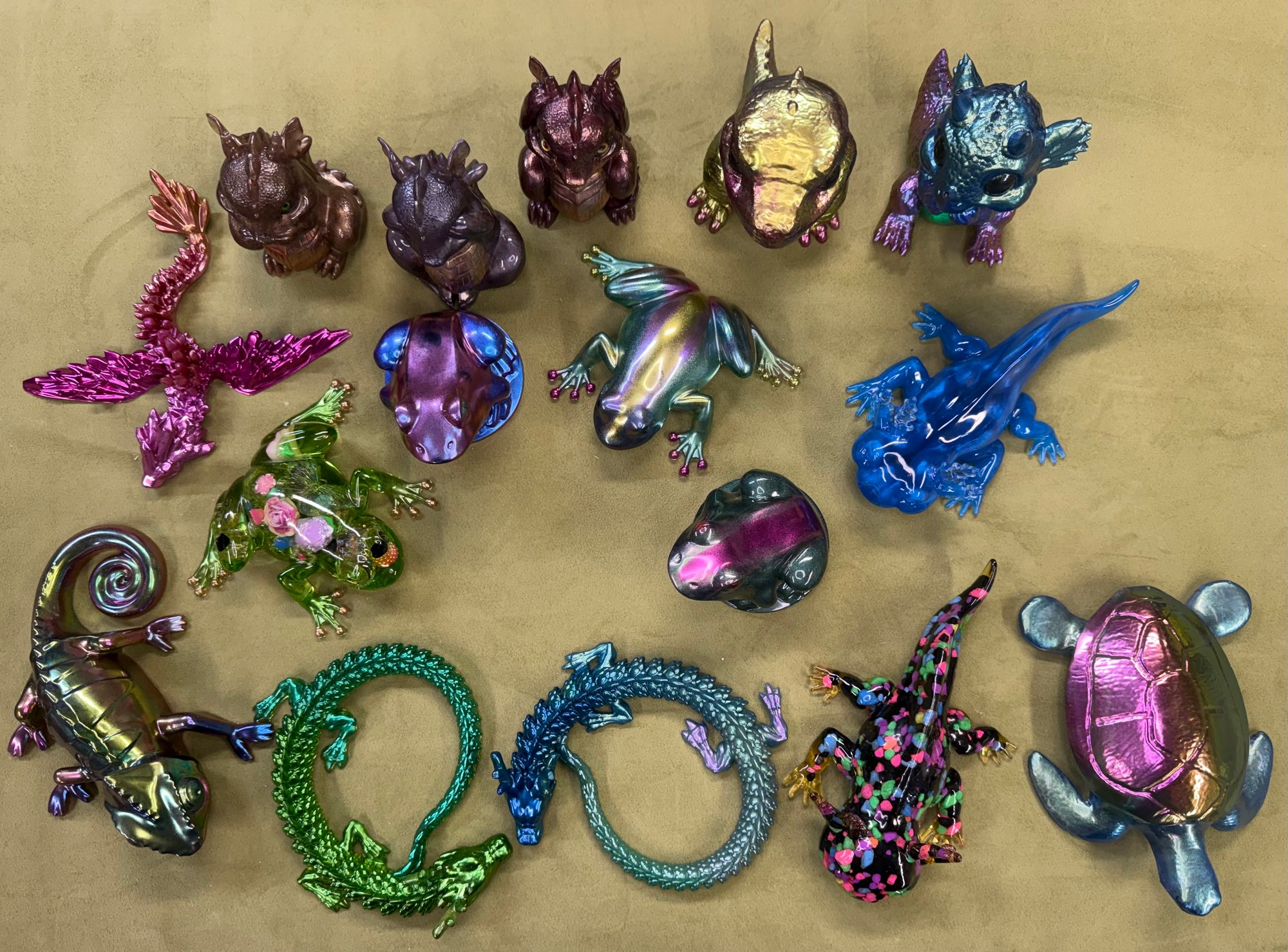 All hand painted Epoxy Resin art. Dragons, Wall Art, Flowers, Dinosaurs, and Reptiles. Each unique in their own way. Choose from Frogs to Lizards or a Rose to hang on a wall. Can also be made to order.