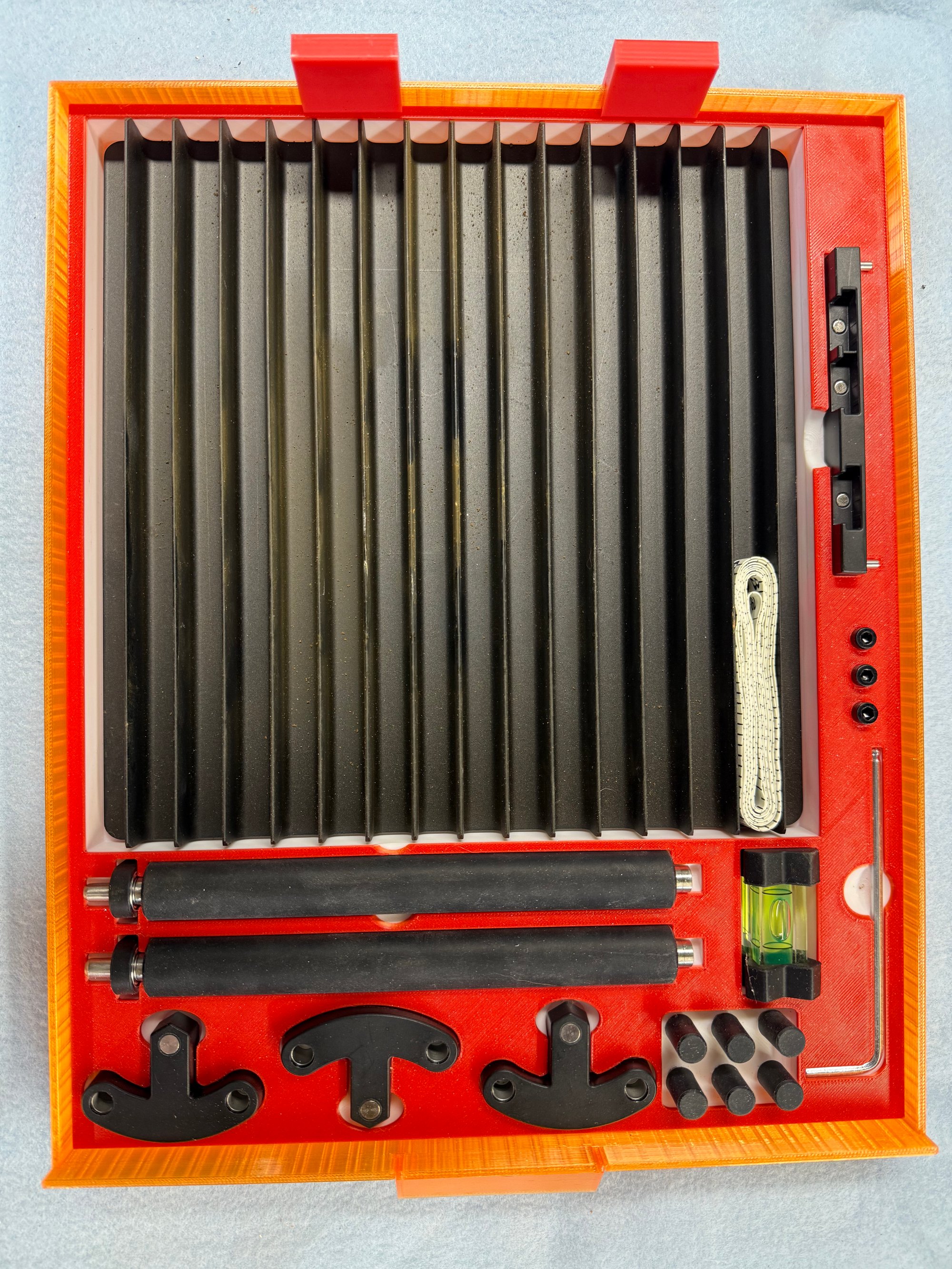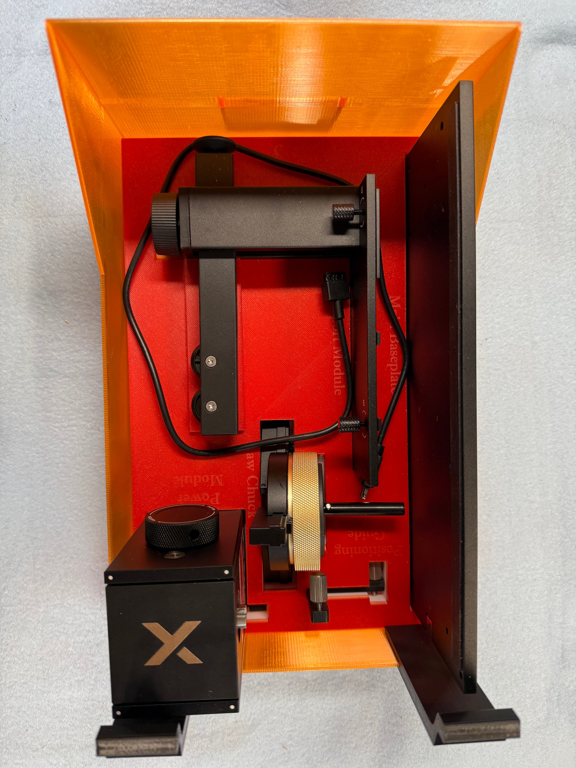 For owners of this laser, where do you store your lens, riser plate and other accessories? This is something I designed for the one I own, it has a drawer for either lens, the spare cover, the riser for inner engraving, and if you also have the RA3, which most certainly do for glass works, there is a tray to hold ALL the parts. Keeps it all organized and handy. This is printed on an H2Series Bambu Labs 3D printer, so in order to print the STL, you will need a printer with at least 300 mm of room. The STL includes all the parts, the drawers, base unit which is printed in two parts, and all the inserts. Also included are Bambu Studio slicer settings for using the pre-made supports, not slicer supports, along with the infill and wall settings I used to reduce the amount of filament used while maintaining a strong structure.